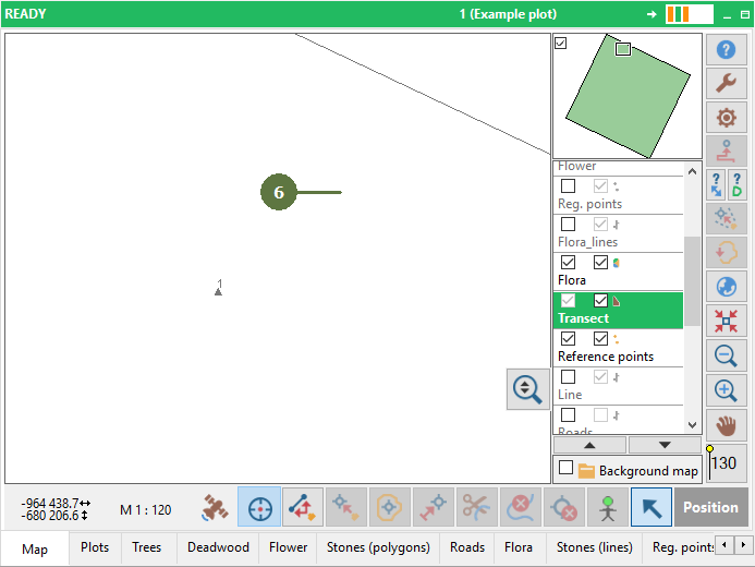 1. Switch to the Map form 2. Select the Transect layer 3. Select the transect line which you want to delete The selected line turns green 4. Click the Delete line button