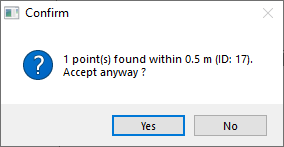 During measuring of a new point/tree this function helps you to find if another entity is within the search tolerance. The search tolerance is defined (0.5 m)