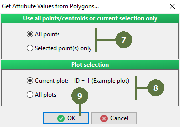 This function enables to attach and transfer attributes between points/centroids/trees and polygons. When no point/tree/centroid is selected in the map, transfer of attribute values is applicable for all records. When some points/ trees/centroids are selected, transfer of attribute values is applicable only for the selected records.