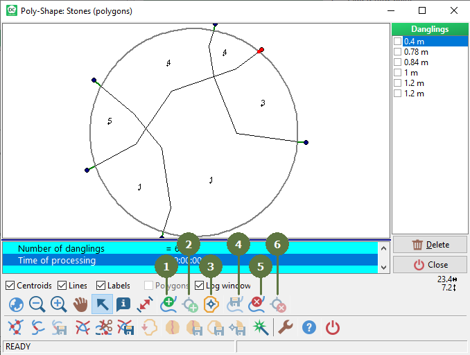 If a line layer participates in a polygonization, particular lines can be cut to pieces. After returning into Field-Map, these pieces are saved as new lines with all attributes of its original lines including attributes of all slave tables (line length is corrected). When moving lines into another layer, duplicate lines are checked and rejected if any. When saving lines, Field-Map attempts to save its original attributes. If there are corresponding attribute names in the original and the target layers, values are saved. Extra attributes in the original layer are passed by.