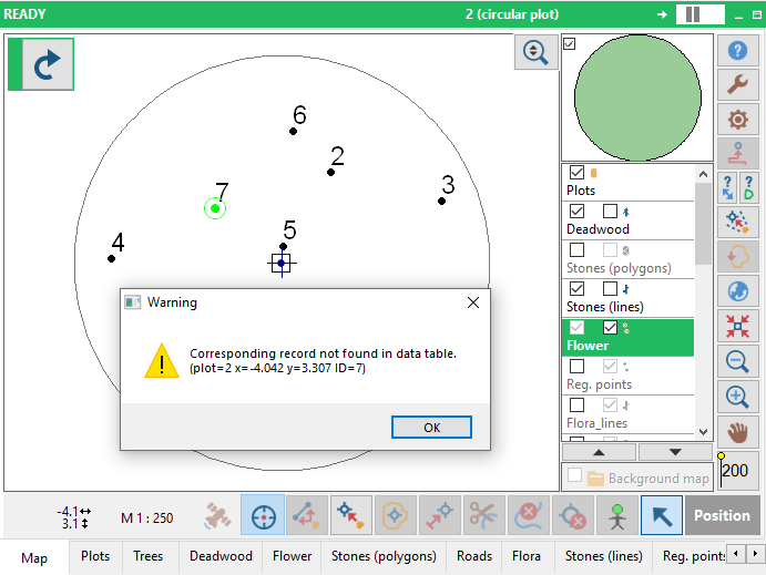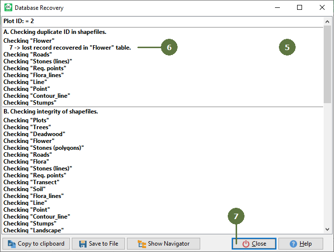 Field-Map has several features ensuring database consistency even in case of unexpected situations such as power failure. In such situations the database consistency may be lost or degraded. Events, which may damage the database, will be notified by a warning message (see below - example). Run Refresh database function immediately after this message appears. A procedure compares data from data table with those in the shapefile. Missing records are automatically recreated and information about all recovery steps is displayed. The report of check data procedure with all changes listed can be saved directly to the file or copied to clipboard. Database recovery function is available only for Points and Trees layers. |