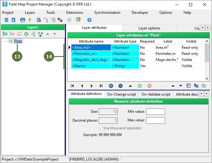 Plot shape Choose “User-defined plots“ if you do not know the shape of your plot or if you are planning to use more shapes in one project. Note: It is not possible to use segments if the option “User-defined plots” is selected. Choose “Circular plots” if you already know that your plots are circular. Choose “Plot border from template“ if you already know shapes of your plots and segments (see the Using templates chapter for further details). Database format The internal structure of the Field-Map database is based on FireBird, MS Access tables or MSSQL database for storage of attributes and ArcView shapefiles for storage of geographical entities. It is easily possible to convert the attribute tables to dBase, MS excel, XML and other formats by using the export utility of Field-Map Project Manager. Root Plot layer in Field-Map Each Field-Map project must have a root layer (“Plots”). Even if you do not need to edit the map (for projects without spatial relationships), the root Plots layer is necessary. The Plots layer has a unique function. All the other layers are related to this root layer as children regardless of whether the child layer is a Map layer or a Data layer. Project directory When your project is created, all the necessary directories and files are created too. Do not alter or delete any of these files or folders unless you are an advanced user. |