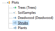 This feature may be interesting when you want to set the order in which data is collected. For example, a field worker should first assign data to map layers (Trees, Soil samples and Deadwood) and then to data layers (Shrubs and Plants). In such case you will move the “Shrubs” layer just above “Plants” as demonstrated below. The layer order is conveyed to Field-Map Data Collector tab order (see the example below). before: