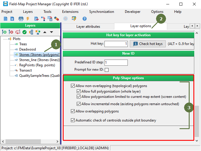 These polygons fulfill topological rule of non-overlapping. They can have common borders, but they cannot overlap. A polygonization can be based on the whole layer or only on the current map extent. If an incremental mode is active, a newly created polygons are added to those previously existing in a polygonal layer. Overlapping polygons There can be polygons, which overlap each other. Note: These settings work only as making Poly-Shape options available to be selected by user. The definite decision which type of polygonization will be performed is done when a user starts Poly-Shape tool (see Field-Map Data Collector help). In other words, a settings described on this page influence only which options will be available to a user when defining Poly-Shape parameters. |