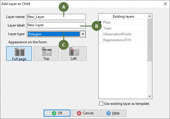 - The Layer name refers to this layer in the database. Spaces are not allowed when typing the layer name (they are automatically replaced with _). The maximum number of characters to be used is 8 (Plots) and 32 (all other layers).