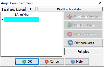 Shoot to trees using TruPulse Dendroscope and built-in optical BAF scale inside TruPulse. Each measurement will be counted by Field-Map as 1. For a border tree (counted as ½) click Border line tree (-0.5). You can delete the last measured tree (button Delete last tree), clear the whole basal area (button Clear basal area) or manually edit the basal area.