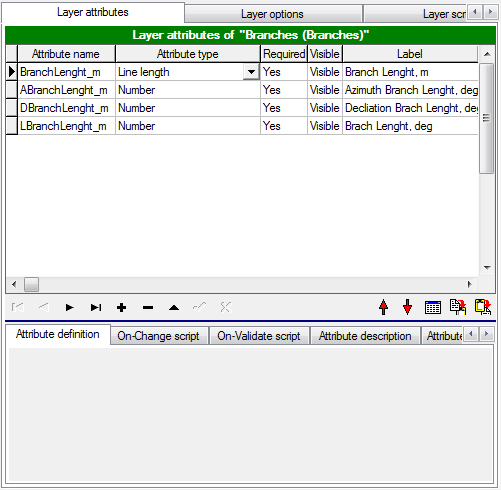 If there is a Line Length (+coordinates) attribute defined in a layer (e.g. BranchLength), three other optional attributes can be created with the same name as the Line Length (+coordinates) attribute and a meaningful prefix A for Azimuth (e.g ABranchLength), D for Declination(e.g. DBranchLength) or L for Line length (e.g. LBranchLength). These are numerical attributes which automatically extract and store azimuth, declination or line length from the Line Length (+coordinates) attribute of the same name.