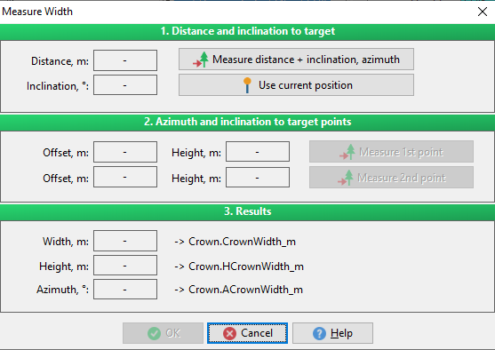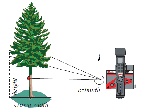 Width (+height, azimuth)is a floating point number representing the width of a line (usually used for measuring the width of a crown projection).