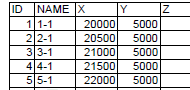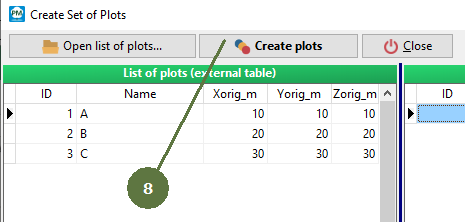 A statistical inventory usually uses a grid of circular plots of the same size. It would be inconvenient to establish every single plot individually in Field-Map Data Collector. Thus the function “Create set of Plots” automatically generates a set of plots based on an imported table containing four mandatory columns (see the example below).