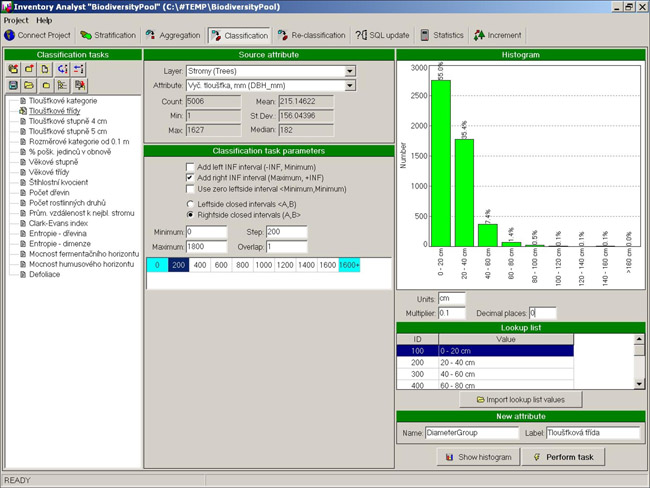 This tool allows the Field-Map user to classify measurement data into classes: age to age classes, tree diameter into diameter classes, etc.