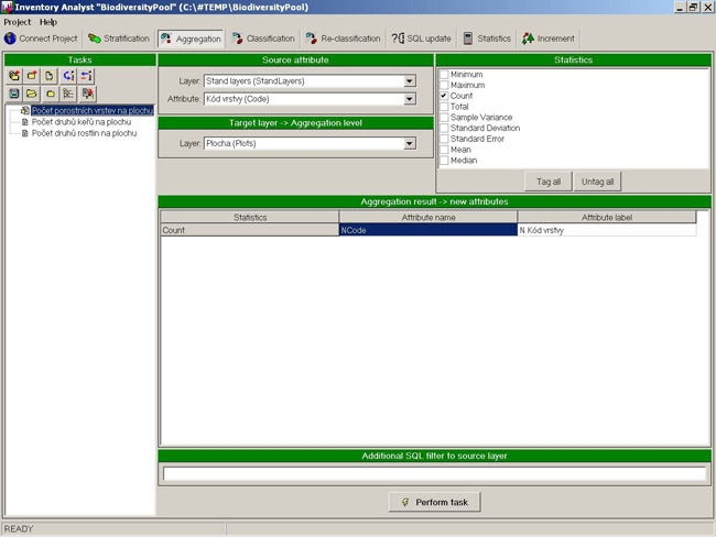 This tool aggregates data of specific data layers and store results in a parent layer; e.g. summarize deadwood logs within a plot, calculate mean log volume, etc.