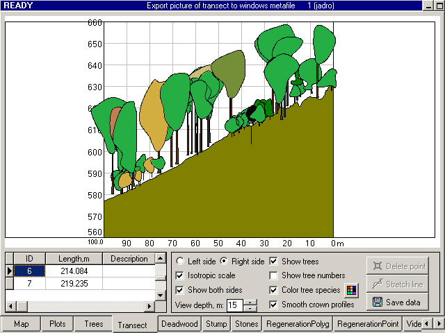 Transects are used to visualize vertical terrain profiles and vertical tree projections. For transects the Field-Map operator needs to measure a line passing through the plot and then measure all trees (position and crown parameters) in a defined buffer distance on both sides of the line.
